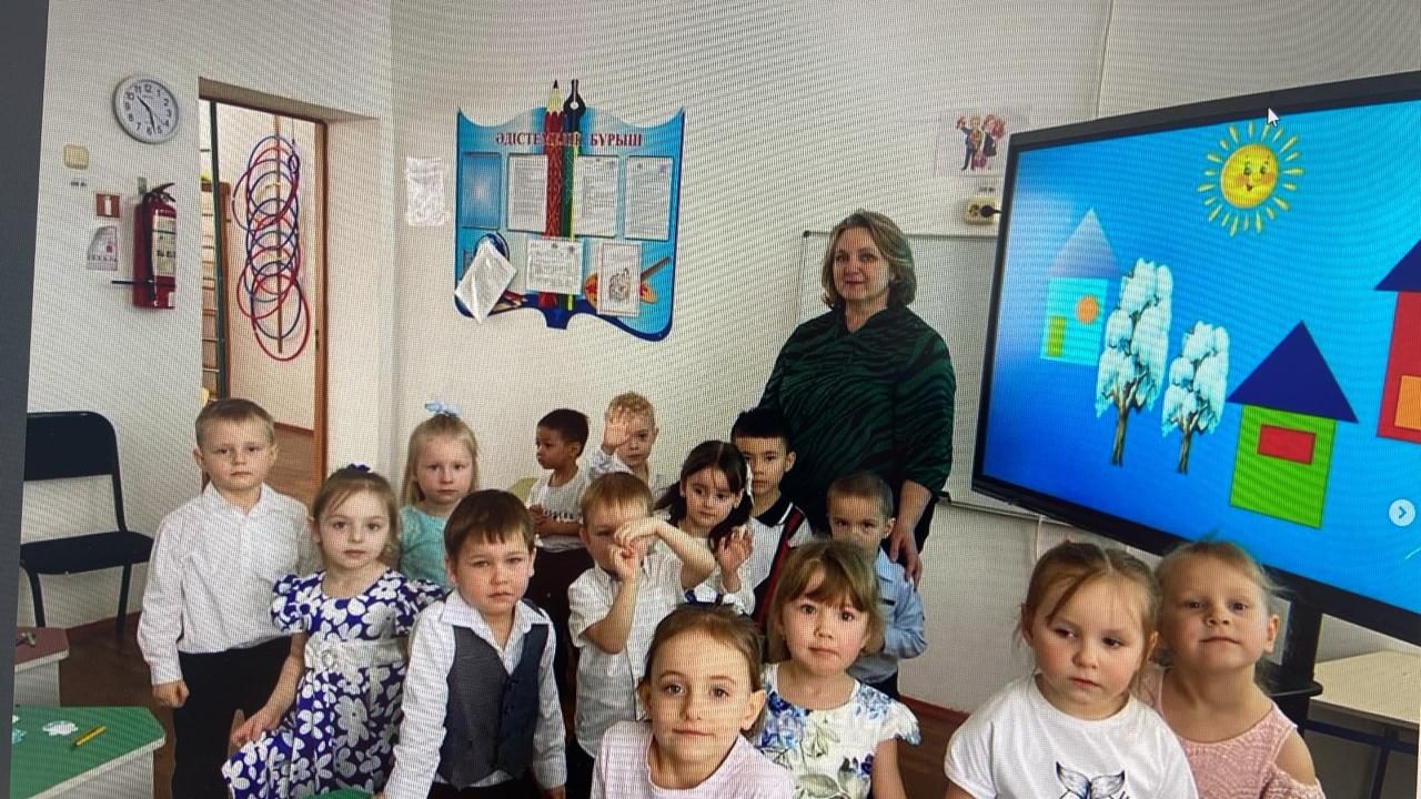 Балалар экранмен жұмыс істеп, «Не жоғалды?» ойынын ойнады және геометриялық фигуралардан үй «тұрғызды».